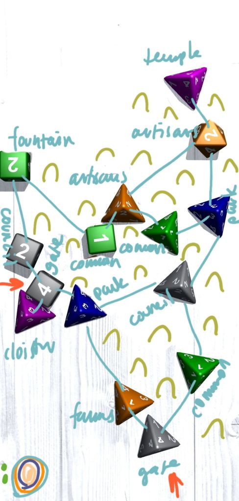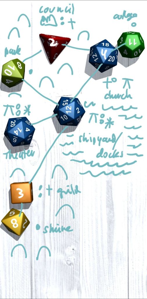 This process still doesn’t do a couple of things I would like it to do. In “230” gates were tied to the d20s—as in, all the d20 neighborhoods essentially had a second sub-identity associated with a point of entry into the city located there. I’m not super chewed up about it being gone, as the gate identities were highly subjective, but I do miss the simplicity of just saying here’s where the gates are without a second thought. To be fair, the gray dice do have a neighborhood type called “gate” (two examples above in fact), but they don’t occur very frequently (and in theory they would, since “4” can be a result on any die, but of course that’s not a guarantee, otherwise why are we rolling dice). One thought I had was that all gray neighborhoods would be routes in and out of the city, but there’s also a result called “wall” and that would be incongruous.